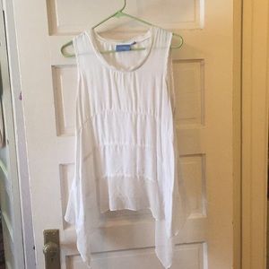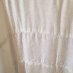 Pretty top with chiffon detail at bottom. Beautiful movement. Some piling but blends into the white. Draping on sides adds interest and flattering fit.