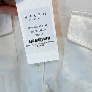 This top features a relaxed fit with flutter sleeves and a notched collar, offering a blend of elegance and comfort. The pure white color enhances its versatility, making it suitable for various occasions. Its 3/4 sleeve length adds a modern touch to this classic button-down style.