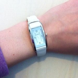 I hardly ever wear this Fossil watch anymore, but since it's white it goes with everything! I have no idea how you set it, I never wore it to tell time just to look cute lol.