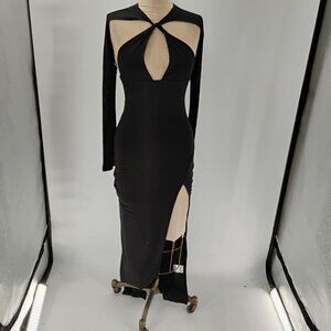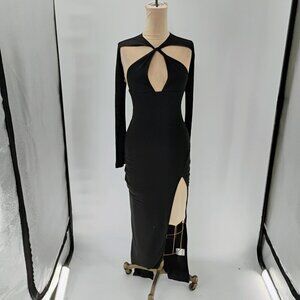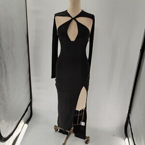 This is a Black Cannes Cut-Out Halter Gown from White Fox in size XS. The gown is sleeveless with a halter neckline and a zip closure. It is made of Polyester Spandex material with a solid pattern. The dress is long in length and suitable for occasions like weddings, parties, or formal events. It features a cut out design and is perfect for the summer, fall, or spring seasons.