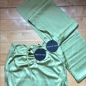 Step into the spotlight with this captivating matcha green scarf wrap top and mini skirt set from White Fox Boutique. Featuring a chic halter neckline, perfect for a night out. The ruched design adds a touch of elegance, ensuring you make a statement wherever you go.