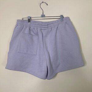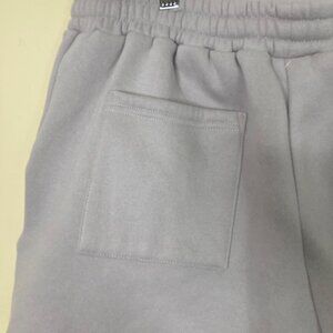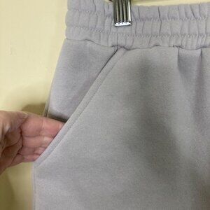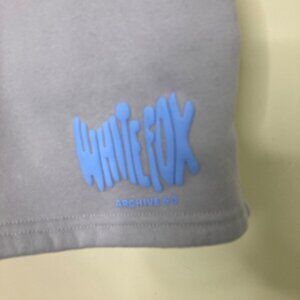 Soft Gray Blue sweat shorts by White Fox, in size L, designed with an elastic waistband and adjustable drawstring. Features front pockets and a rear patch pocket. Crafted for comfort and style, suitable for casual wear or lounging.