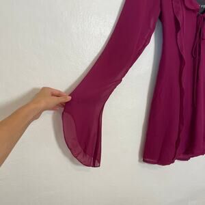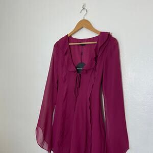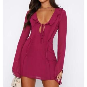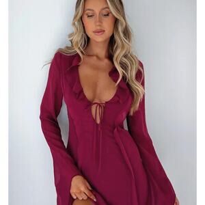 flirty and bold, the white fox – falling to pieces mini dress comes in a striking berry shade with a curve-hugging silhouette. made from lightweight sheer polyester, it features a deep v-neckline with ruffle trim, tie-front keyhole, long sheer bell sleeves, and a mini length that’s perfect for a statement night out. new with tags, this dress is made for parties, concerts, or date nights — just add strappy heels and a clutch for the ultimate going-out look.