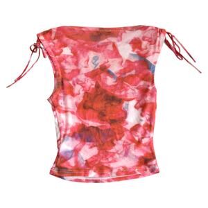 White Fox mesh tank. Features a sheer mesh fabric with bold red/pink abstract print and tie shoulders. Lightweight, stretchy, and perfect for Y2K, festival, or layering looks.