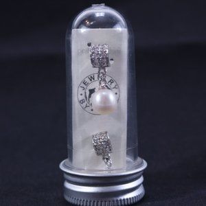Here is a pair of Genuine 8mm White Fresh Water Pearl Hanging Post Earrings. The top of the earring is 925 Sterling Silver with Swarovski CZs. The posts are 925 Sterling Silver. All the silver is 100% Nickel Free.