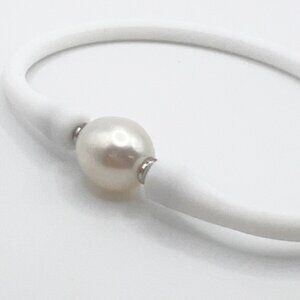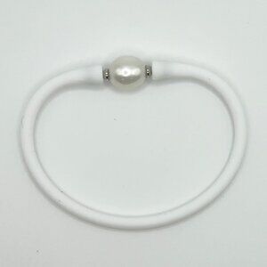 This stretch bracelet has an 11.0 mm cultured freshwater white pearl and white silicone rubber bracelet, 7.5 inches.