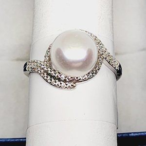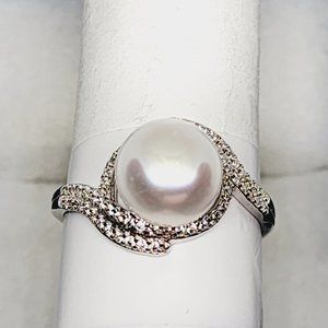 White Freshwater Pearl & Cubic Zirconia ring inn Rhodium over 925SS sz 9 .35 cts