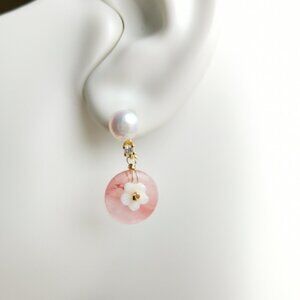 White Freshwater Pearl Rhodochrosite Carved Mother of Pearl Earrings