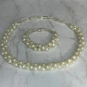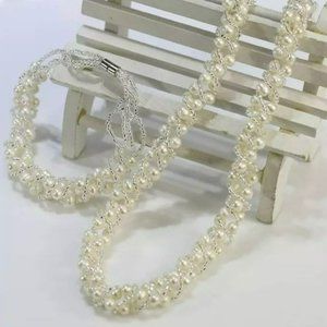 White Freshwater Pearls With Crystals Woven Thread Necklace Set Magnetic Clasp