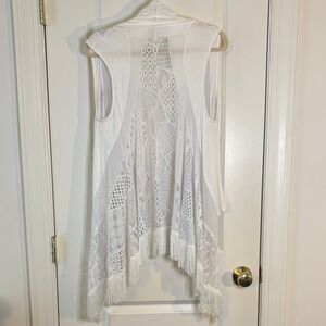Elegant white cardigan with fringe detailing, perfect for layering. Add a touch of Boho to any outfit.
