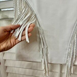 White fringe mini skirt. Size L. Hits mid thigh on me and I am 5'4" #fringeskirt
