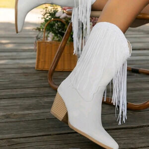 White Fringed Irregular High Heeled Silver Knight Boots For Women's Fashi