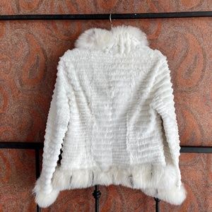 This is white fur jacket. The fur is rex rabbit and fox. It is extremely soft. It has never been worn. I bought it in Miami.