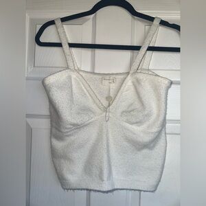 Stay cozy and stylish with this white fuzzy crop top. Perfect for layering or wearing on its own, this top adds a touch of elegance to any outfit.