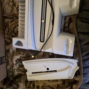 White gaming console shell with black accents. Includes a detachable panel. Cooling system