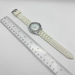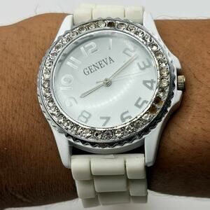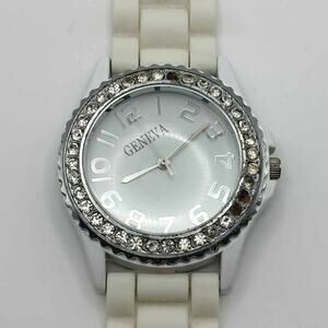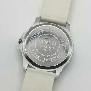White Geneva Men’s Watch. Fully functional with brand new batteries. Adjustable band fits 7 1/2 in wrist or near. Had some minor wear (Shown in Photos)