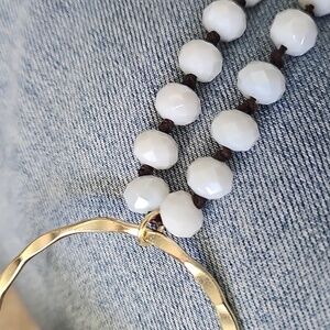 White Glass Beaded Necklace With Gold Hoop.