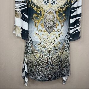 White Gold Black Rhinestone Accent V Neck Stretch Tunic Blouse R Rouge