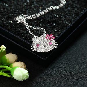 White Gold Plated Hello Kitty 25" Long Chain Necklace with Pink Cubic Zirconia