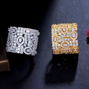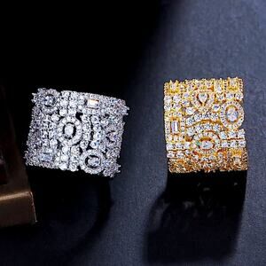 White Gold Plated Zircon Ring, Adjustable, Wide Band, Statement Jewelry