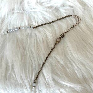 Gold chain has some signs of tarnishing but has tons of life left. Laying flat and clasped on the longest hook, the necklace measures approximately 18.5". Can be adjusted to be shorter, too!