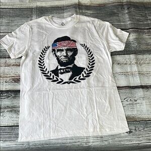 Men's White Graphic T-Shirt with Abraham Lincoln Patriotic Design SZ MediumShow off your style with this white graphic t-shirt featuring a unique patriotic design. Perfect for casual outings.
