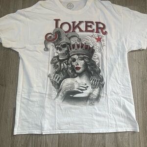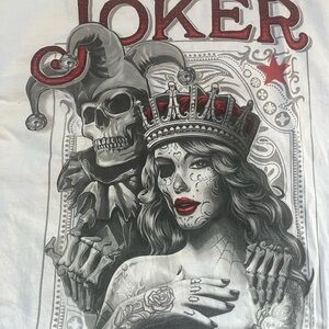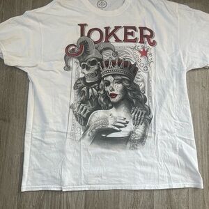 This stylish white graphic tee features a bold Joker design, perfect for casual outings. The short sleeves and comfortable fit make it a great addition to any wardrobe.