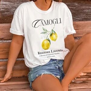 This stylish white graphic tee features a vibrant lemon print, perfect for casual outings. Enjoy the comfort and chic design of this versatile top.