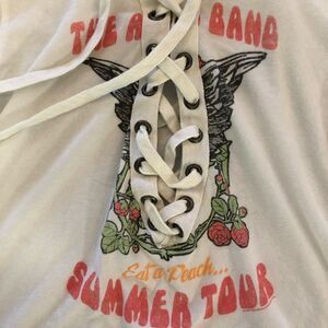 Stylish white top featuring a unique graphic design and lace-up front. Perfect for casual outings.