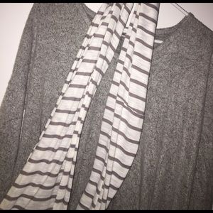 This is a gray and white infinity scarf in which can be worn in many different styles! Nice and thin also
