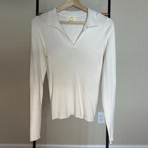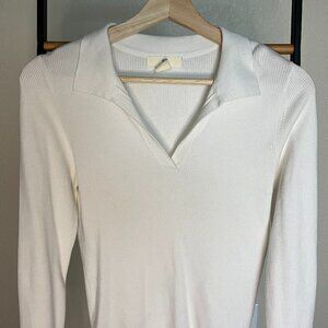 White long-sleeve knit sweater with a soft, ribbed texture. It features a collared neckline with a V-cut opening, giving it a polished yet casual look. Simple and minimalistic, it’s a classic piece that can be styled for both casual and dressier outfits.