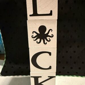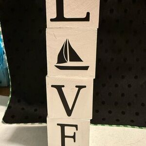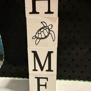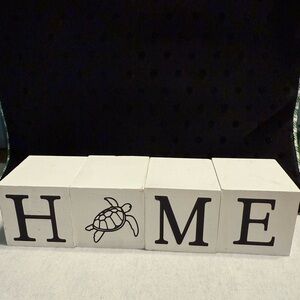 Set of white decorative blocks spelling 'HOME' with a turtle design. Perfect for home decor. Each side of block has different letters and design - HOME-LUCK-LOVE-HOPE - Designs are shark-octopus-turtle and sailboat