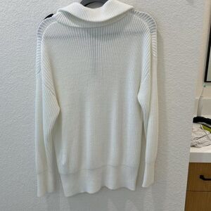 Stay warm and stylish with this classic white half-zip sweater. Perfect for any occasion.