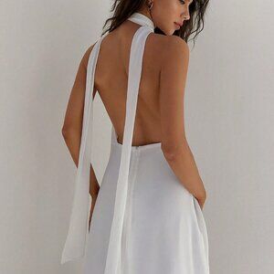 White Halter Backless V-Neck Womens Chiffon Cinched Waist A-Line Dress