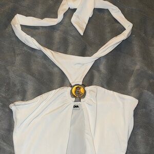Stylish white halter one-piece with a chic front cutout and gold accent.