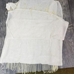 A beautiful white hand beaded shawl with fringe. The wrap is 70" long and 20" wide. Perfect for a winter wedding