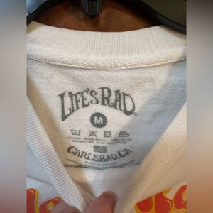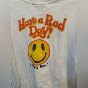 White sweatshirt with 'Have a Rad Day' graphic and smiley face.