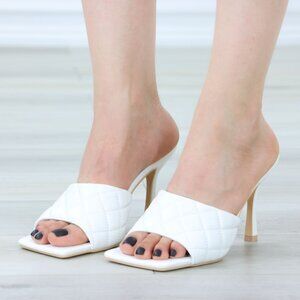 White Heeled Quilted Pattern Mule Open Squared Toe High Heel Sandal