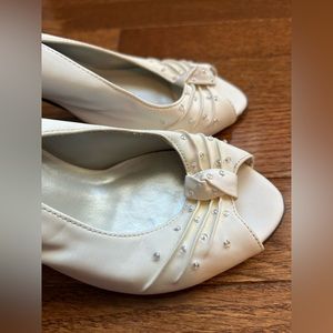 White heels, size 5, peep toe, rhinestones near toes, elastic heel strap, 3.5 in heel