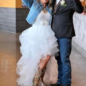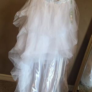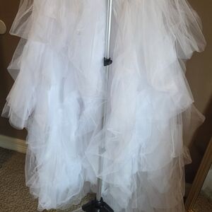 Elegant white high-low tulle skirt with layered ruffles. Lightweight design creates soft volume and graceful movement. Versatile piece for formal events or styled occasions. Comfortable waist for easy wear.
