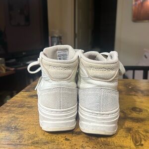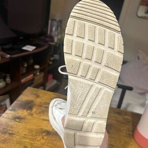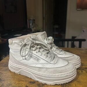 Cream high-top sneakers with lace-up closure. Ideal for everyday style. Super comfortable, I just don’t wear them.