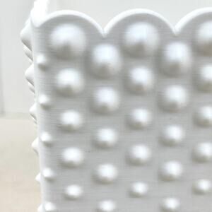 Add a playful yet elegant touch to your home with this small 3D printed decorative bowl, inspired by vintage hobnail milk glass! With its charming scalloped rim, raised dot texture, and modern pedestal base, this piece is a perfect blend of classic and contemporary. Ideal for holding keys, jewelry, trinkets, or simply adding texture to a styled shelf or coffee table.