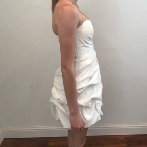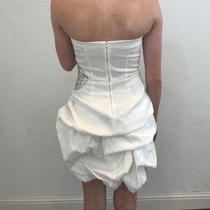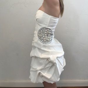 White homecoming dress with gray, sparkling design on left side. It is a 3 but fits like a 2.