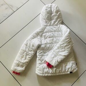 Stylish white puffer jacket for kids. Features pink accents and a cozy hood. Perfect for cold weather. There is a yellow stain on back of the left sleeve