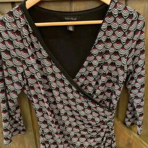 White House Back Market Faux Wrap Dress size 6 V-neck Long sleeve Geometric. This dress is pre-owned. Good condition. No flaws. Measurements: 15 inch chest 12 inch waist 37 inch length 18 inch arm length