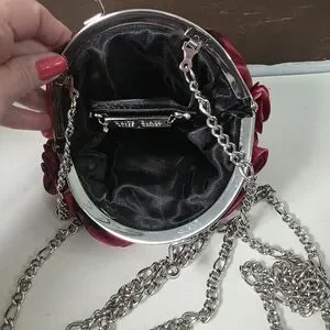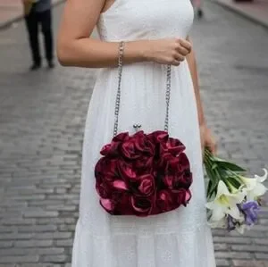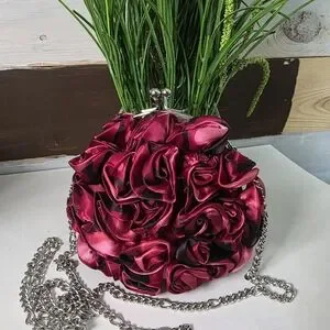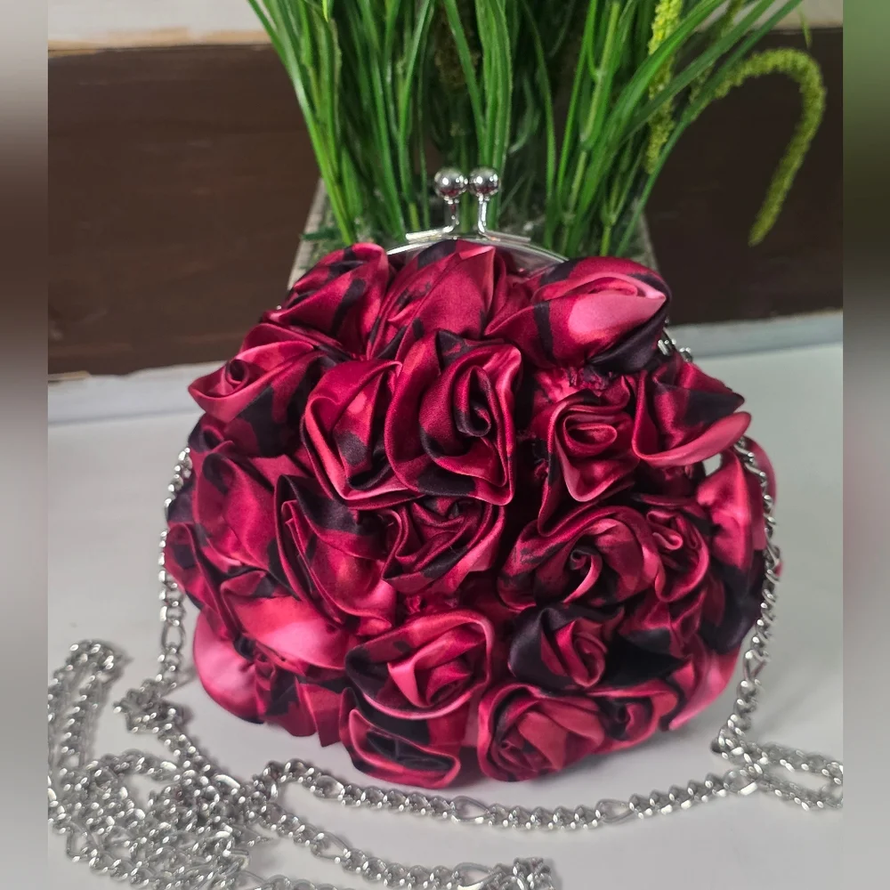 White House Black Market 3D satin rose clutch is a classic evening accessory, featuring a silver-tone chain strap which can be put inside to wear as a clutch. Has a secure kiss-lock closure. NWOT EXCELLENT CONDITION