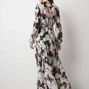 Embrace the season with this floral maxi dress in classic black and white. The blouson sleeves and lightweight georgette fabric add to its feminine style. A printed slip lining hits at the knee, leaving a sheer skirt flowing to the hemline. Elastic at the wrists and waist ensure a great fit. Fitted at the bust, relaxed through the hips