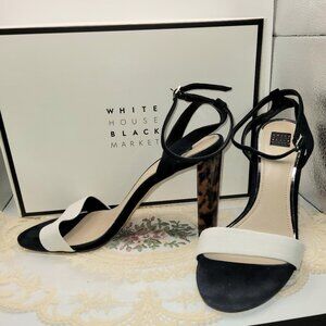 This cuties have it all, black, cream with a touch of leopard print that gives these beautiful heels a real spark of interest and make them oh so versatile! Slight sole wear and always stored in original box and original White House Black Market shoe bags which you will receive. 4" leopard patent block heel, cream strap over vamp and gorgeous suede black ankle strap. These heels are definitely unique and you will definitely get lots of compliments! I don't think I've ever seen another pair quite like these and I own ALOT of heels!