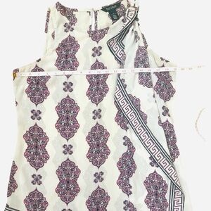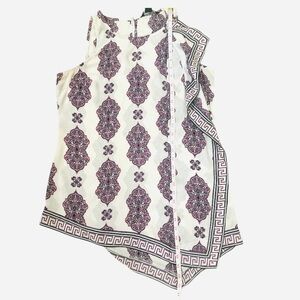 Add a touch of elegance to your wardrobe with this stunning White House Black Market Asymmetrical Tunic! This chic top features a beautiful white base with an intricate purple and black geometric pattern, including elegant medallion designs and Greek key borders. The asymmetrical hemline adds a modern twist, while the sleeveless, rounded neckline offers a comfortable and versatile fit. Perfect for pairing with white pants, leggings, or a skirt for a sophisticated day-to-night look. Crafted from lightweight, flowy fabric, this tunic is ideal for warm weather or layering.