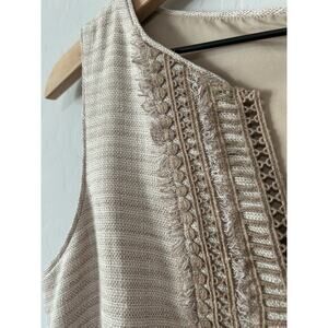 Chic beige dress with unique asymmetrical cut. Features detailed neckline and hem. Sleeveless design.